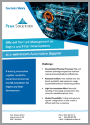 Die interne Testabteilung eines namhaften internationalen Automobilzulieferers stand vor einer großen Herausforderung: Die effiziente Planung und Verwaltung zahlreicher Prüfstände, Testgeräte und Ressourcen war durch veraltete manuelle Prozesse erschwert. Mit der Einführung der Peak Test Management Suite wurde eine innovative Lösung gefunden, die Transparenz schafft, die Prüfstandsauslastung optimiert und die gesamte Testplanung zuverlässig macht.