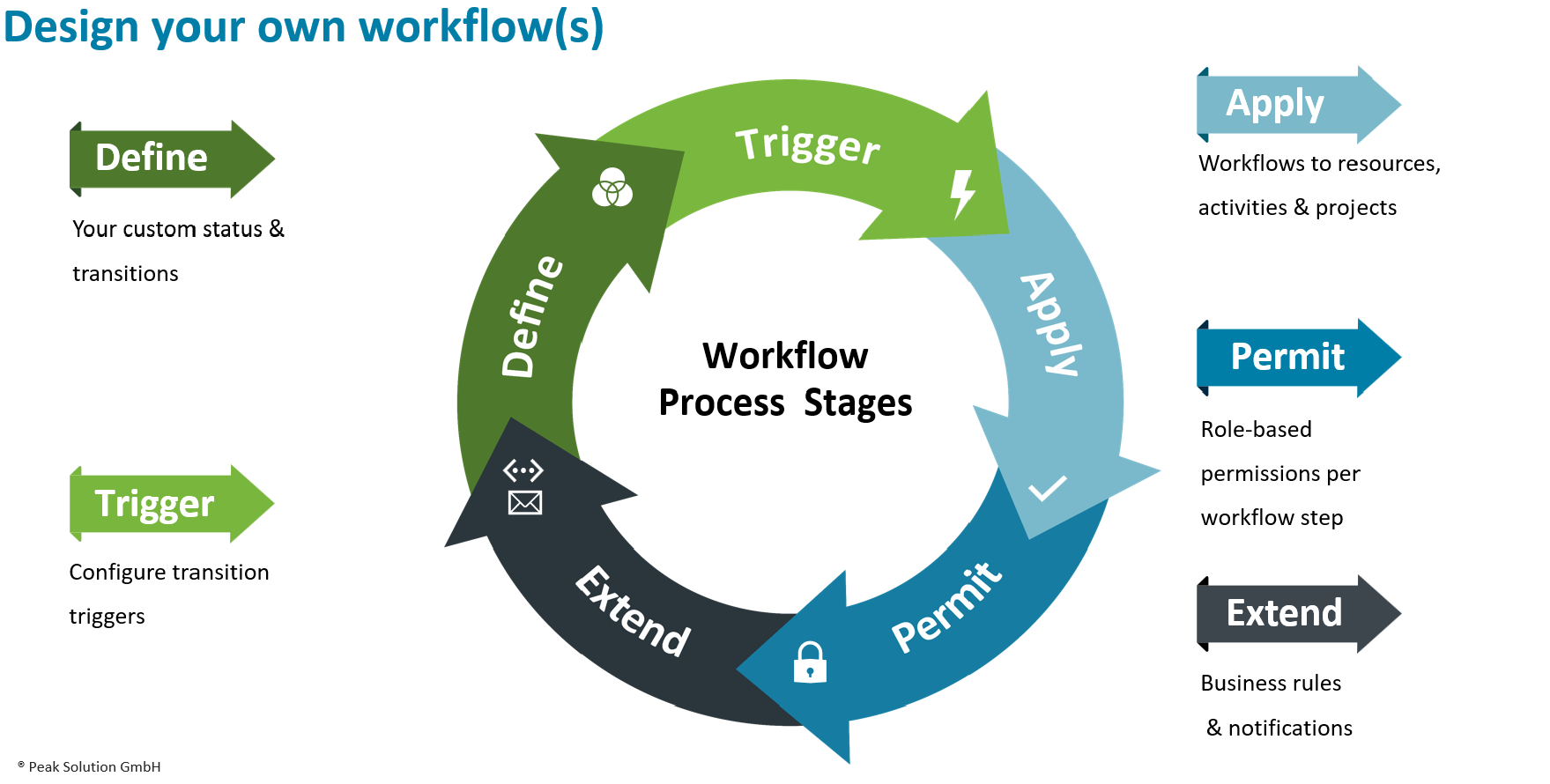 PeakTMS allows you to describe multiple processes as status flows. You can define any statuses and allowed transitions. When applied in one of your specific processes, events and actions can be defined to transition a test from 'Requested' to 'Approved,' for example. The various events and actions can be directly integrated into the user interfaces.