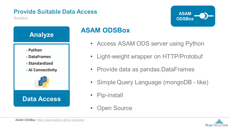 ASAM ODSBox is a lightweight Python wrapper on top of the ASAM ODS HTTP-API. By providing the ASAM ODS data in form of pandas.DataFrames, not only Python analysis and machine learning tools such as TensorFlow or scikit-learn can directly be used, but also Power BI is capable accessing data this way.
