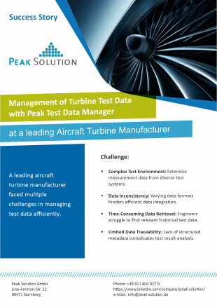 The case study illustrates how a company in the aerospace industry, by working with Peak Solution, has introduced a future-proof test data management system that not only meets current challenges, but is also ideally equipped for future requirements.